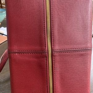 JCrew Ruby Leather Pebbled Satchel. Gold hardware, detachable strap. Zipper inside with pockets for phone. Overall good condition, a bit worn on handles, strap and bottom corners. The color is so pretty with the gold hardware. Medium-sized satchel, 10.5" long, 7.5" wide @ bottom, 8" tall w/o handles, 14" tall with. handles.