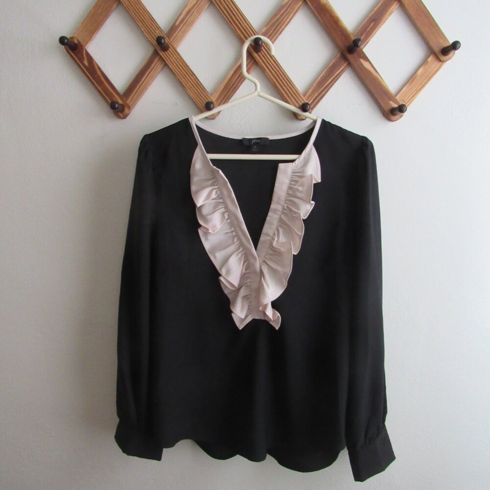 J.Crew black v-neck top with pale pink ruffle and binding at the neck, sleeves are cuffed at the wrists, loose fit, like new