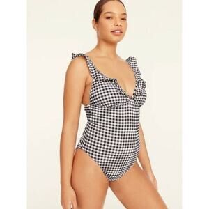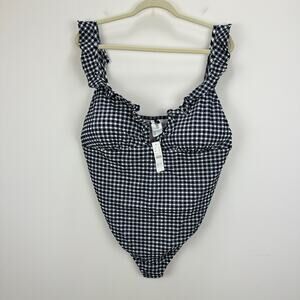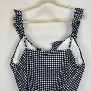 J.Crew Ruffle V Neck One Piece Gingham Swimsuit Padded Navy Retro US 24 NWT