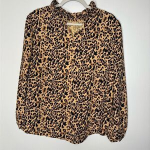J.Crew Ruffle Neck Top Leopard Medium Long Sleeve 365 crepe AJ555 Ocelot Multi