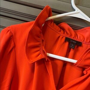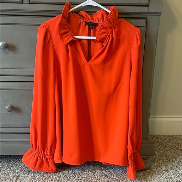 Add a pop of color to your wardrobe with this elegant red/orange blouse. Featuring stylish ruffles, it's perfect for any occasion. Pulls more vibrant red than orange.
