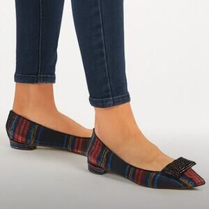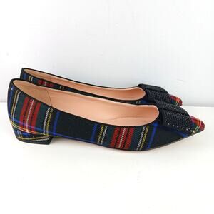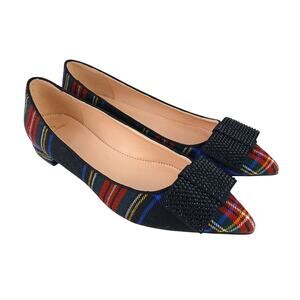 J.Crew SZ 8.5 Pointed-toe flats in Red & Black Tartan Crystal Black Bows NEW