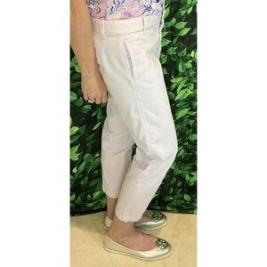 Fresh and classic, these J.Crew “Scout” capris are cut from crisp 100% cotton in a very pale lavender shade. Flat-front style with side pockets, back welt pockets, and a straight cropped leg that hits at mid-calf. Lightweight and breathable, perfect for spring and summer.