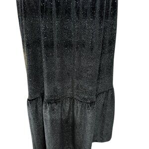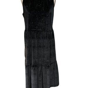 Elegant and effortless J.Crew shimmer velvet midi dress in rich black with subtle sparkle throughout. Features a ruffled mock neck, sleeveless design, and tiered skirt for a flattering drape. Perfect for holiday parties, special events, or date nights.