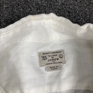 The J.Crew Shirt is a classic white linen blend button-down shirt in size Large. Featuring a solid pattern, long sleeves, and a collared neckline, this shirt is perfect for casual or travel occasions. The woven fabric blend makes it comfortable and easy to care for with machine washable instructions. With a touch of old money style, this J.Crew shirt is a timeless addition to any wardrobe for the summer, fall, or spring seasons.