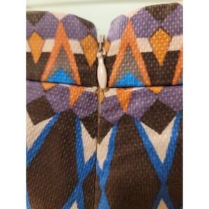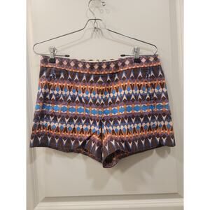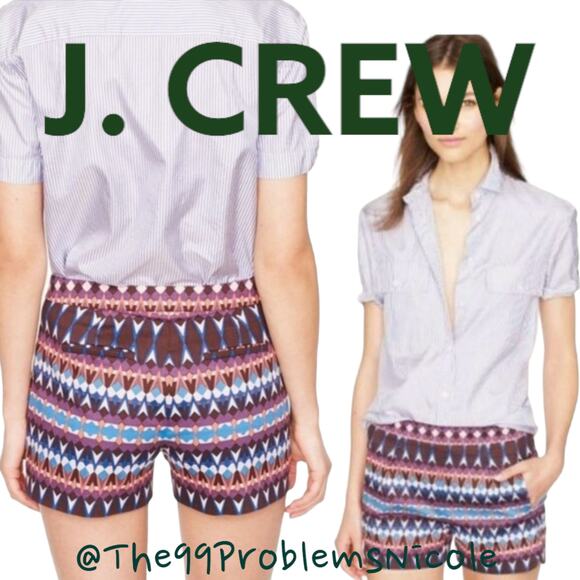 Tribal print J.Crew shorts are the perfect summer look. Purple, pink, teal, orange, and lilac shorts. Muted Barbiecore look. Hidden back zipper and side pockets