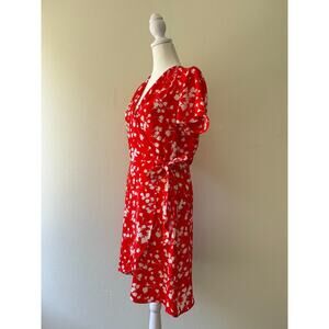 This J.Crew floral wrap mini dress is a chic and versatile piece perfect for warm weather. Designed in a vibrant red with white floral print, it features a flattering true wrap silhouette with an adjustable waist tie. The V-neckline and short sleeves add a feminine touch, while the above-knee length makes it ideal for casual outings, summer parties, or cottagecore-inspired looks.