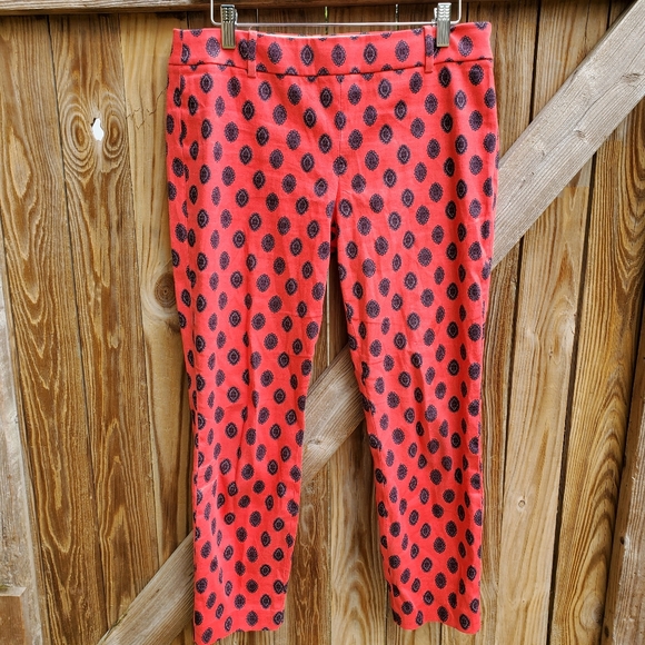 Bright red slack capris with slight purple and black pattern all over! With side zipper!
