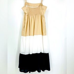 Stylish tiered dress with adjustable spaghetti straps. Features tan, white, and black sections.100% Cotton Two pockets. Zip side closure.Length from pit to hem 43” Size 14 Pre-owned great condition