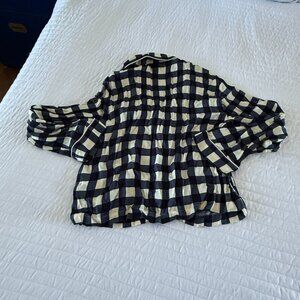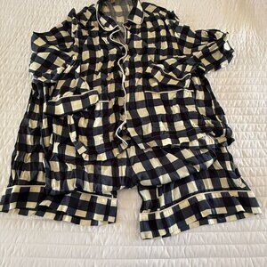 Long sleeved pajama pant set in smooth and silky gingham fabric. Dark navy with White. Loose and flowy fit, runs slightly larger than my other Jcrew pajamas.