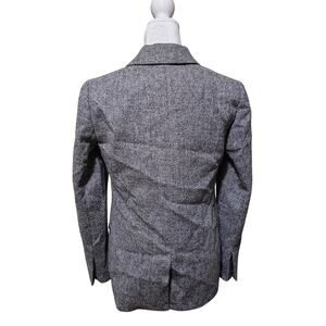 The blazer is made from tweed, wool, which gives it a textured and substantial feel, suggesting warmth and durability. The dominant color is a gray herringbone pattern, offering versatility and a timeless appeal. It features a two-button closure, contributing to a tailored silhouette. The notched lapels and flap pockets are classic details that enhance its traditional style.