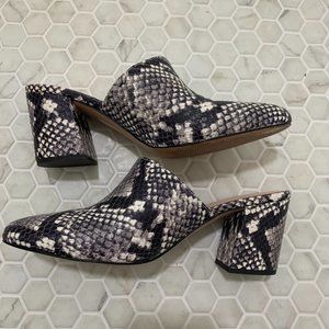 A modern angled block heel & slightly pointed toe make these mules the perfect not-too-fancy shoe. Bonus: a stylish faux snakeskin finish.