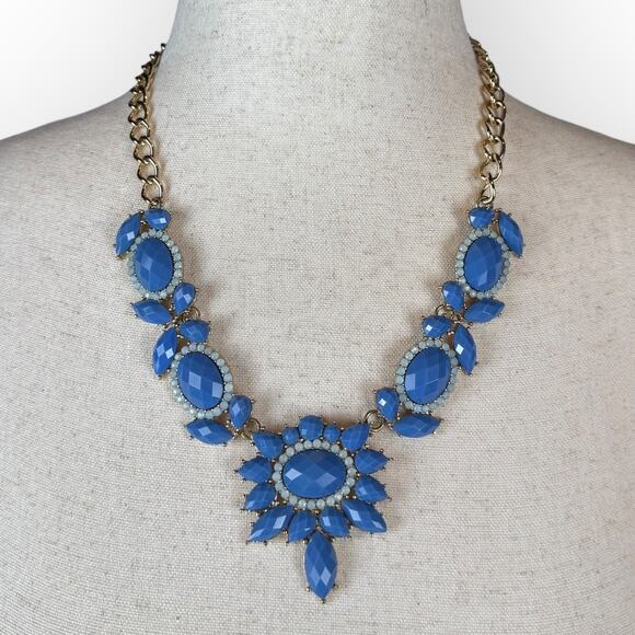 J.Crew Statement Bib Necklace with Blue Jewels and Gold Tone Chain. Faceted Blue Acrylic Stones Arranged in an Ornate Bib Design on a Chunky Gold-Tone Chain. Toggle Closure with J.Crew Hangtag and Small Hanging Crystal. Excellent Condition. Adjustable Length 18"-20"
