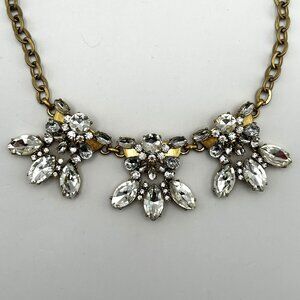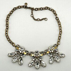 Authentic J.Crew statement necklace features three dazzling crystal floral clusters with faceted glass rhinestones in marquise, pear and round cuts set in antiqued gold tone metal. Adjustable length with lobster clasp closure and J.Crew original hang tag.