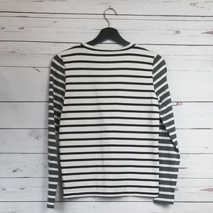 Such a cute tee for cooler weather, features a gray/white stripe on the sleeves, navy/white on the body, and a red/white heart. 100% cotton.