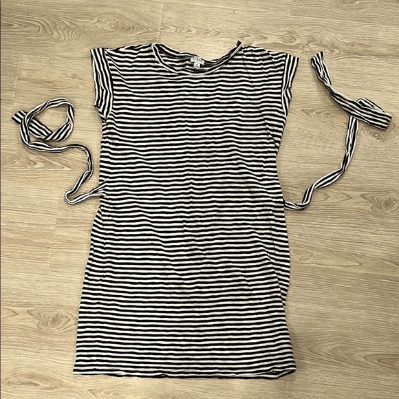 Side ties to cinch in waist. 34” length, cap sleeves.