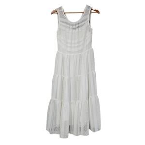 J.Crew Striped Clip Dot Tiered Midi Dress in Ivory. Size XS / Extra Small. Features crew neck, sleeveless, tiered skirt, hidden back zipper closure, striped Swiss dot fabric, and midi length. Style AW793. 100% Polyester. Excellent pre-owned condition, no flaws.