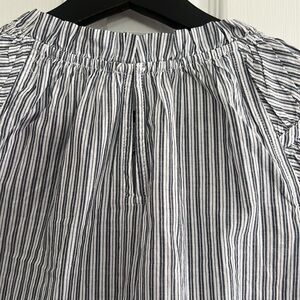 Chic blouse with navy and white stripes. Features short sleeves and a relaxed fit.