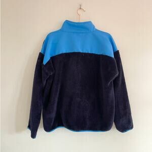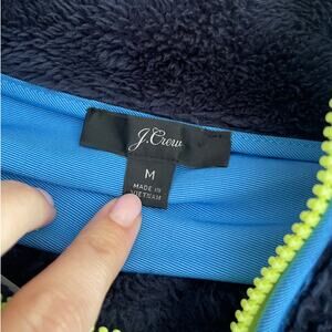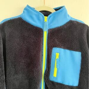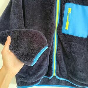 the ultimate cold-weather cozy: this j.crew sherpa zip jacket feels like a cloud with its ultra-soft plush fleece. designed in a navy + bright blue colorblock with contrast piping and a neon zip for a playful pop. relaxed, slightly oversized fit makes it easy to throw on over tees, flannels, or chunky knits. finished with a zip chest pocket and stand collar for extra warmth. perfect for weekend errands, crisp fall walks, or fireside lounging.