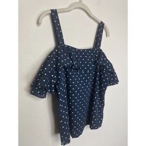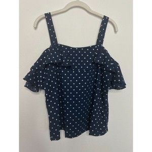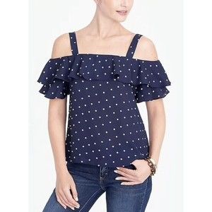 J.Crew Sz 6 Polka Dot Cold Shoulder Top Blue White Ruffle Tiered Cotton Textured