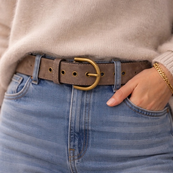 Elevate your style with this chic brown suede belt featuring a striking gold buckle. Perfect for adding a touch of elegance to any outfit.