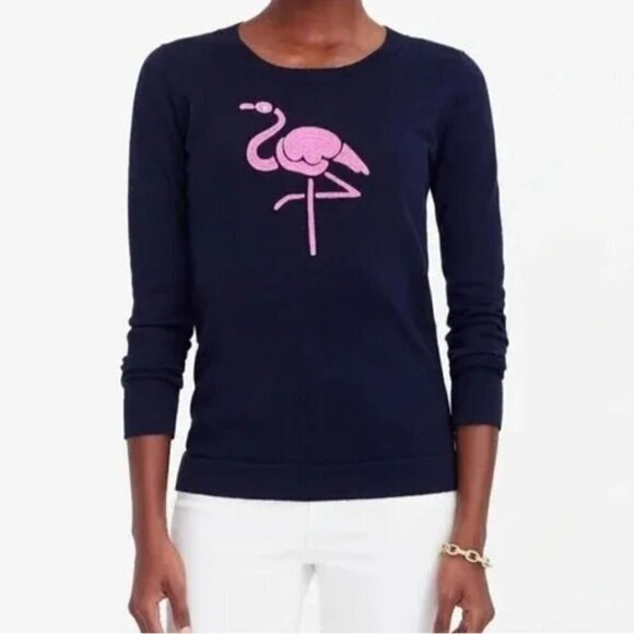 J.Crew Teddie Sweater Navy Hot Pink Embroidered Flamingo Size XS. Pit to pit 20", shoulder to hem 23", Unique, Novelty, Breathable Cotton, All Season, Rhinestone Eye. Good Pre-Owned Condition