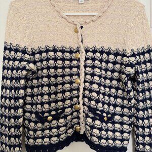 Selling a like-new cream and dark blue crochet lady jacket from J.Crew in size XS. It is lightweight and has a cropped fit. No flaws and never worn.