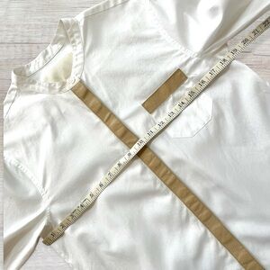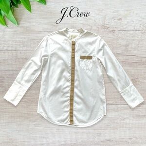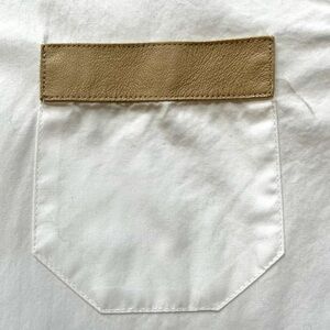 J.Crew Thomas Mason crisp white cotton poplin top with genuine tan leather trim in a flattering tunic length thatโs perfect to pair with leggings for an elevated look. EUC, retailed at $198. Size 6/S, see photos for measurements.