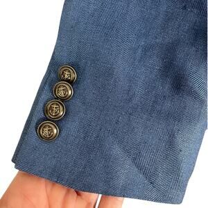 100% linen J.Crew Thompson University Blazer. Two button front, double back vent. Interior pockets. 100% polyester lining. Blue. Size 36R. Please see photos for measurements.