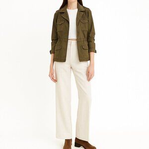 This J.Crew utility jacket blends function and form with timeless military-inspired detailing. Crafted from 100% cotton in a washed olive tone, it features four front pockets, epaulets, and an adjustable drawstring waist for a flattering, structured silhouette. The soft cotton weave gives it a lived-in, vintage feel perfect for year-round wear.