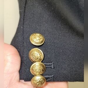 . 4 stacked gold crest buttons on each sleeve