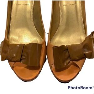 Italian leather. 3” heel. Color is honey glaze. Bows are patent leather. Made in Italy. Excellent condition!