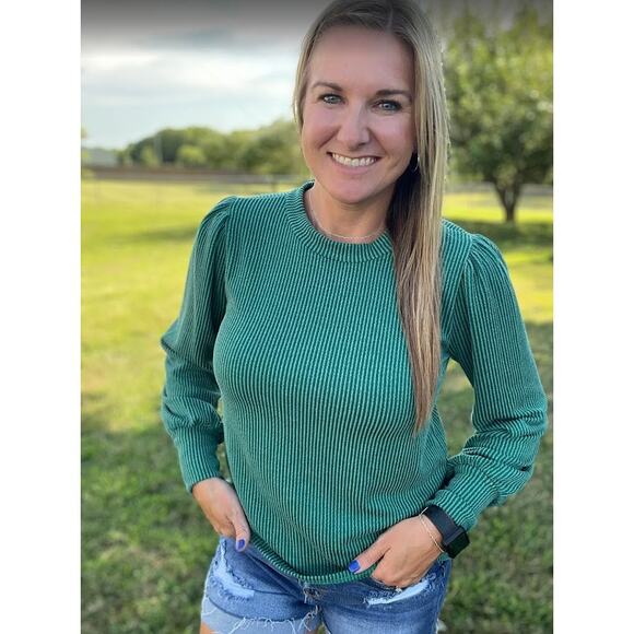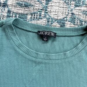 This is a J.Crew "Vintage Rib" puff-sleeve top in green. It's a large women's size and features a ribbed texture throughout the body. The standout detail is the stylish puff sleeves, which add a feminine and modern touch to the classic top. The material is designed to be lightweight with a soft feel and a hint of stretch, making it a comfortable and versatile piece that can be worn casually or dressed up.
