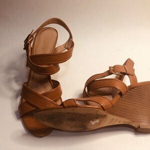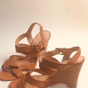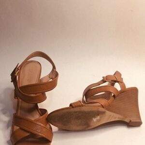 Step out to impress in these wedges featuring a faux-leather vamp constructed in a crisscross design, finished by a wood-inspired heel. Buckle closure.