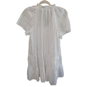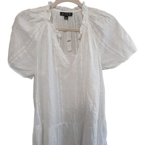 NWT J.Crew cotton mini dress in pristine white. That perfect carefree summer dress! Features a feminine v-neckline with ruffle trim detail, short sleeves, and a beautiful tiered skirt design. The textured cotton fabric adds subtle visual interest.