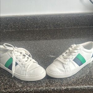 Stylish white sneakers featuring green and blue stripes. Perfect for casual wear.