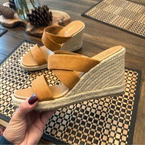 • Features: Wide fabric straps, slip-on design, jute-wrapped wedge heel, cushioned insole