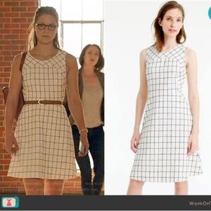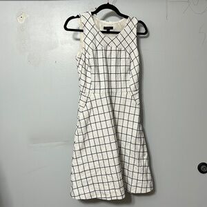 Chic and timeless J.Crew sleeveless fit & flare dress featuring a crisp white fabric with a navy windowpane grid pattern. This flattering piece blends structured tailoring with feminine detail — perfect for office wear, brunches, or special occasions.