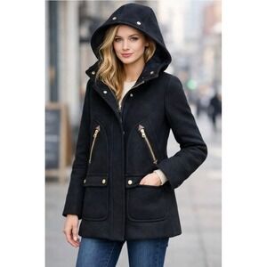 Stadium-cloth wool parka crafted from J.Crew's signature Nello Gori fabric, inspired by the fabric used for old-school stadium blankets. This mid-length coat features a hood, a hidden zip closure with a snap placket, and functional gold-tone hardware. Designed with deep patch snap pockets and diagonal zip pockets, it offers a structured yet cozy silhouette. The rich burgundy wool blend is fully lined for warmth and comfort.Excellent preowned condition. Last picture is the coat in a different color for purposes of showing what the coat looks like on.