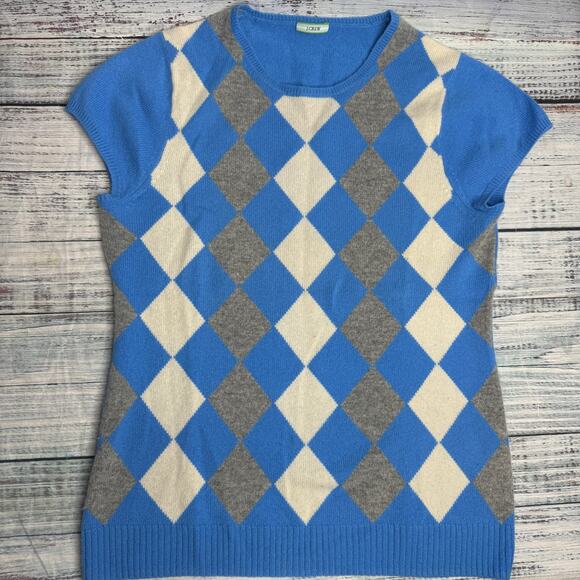 J.Crew Women’s 100% Cashmere Argyle Short-Sleeve Sweater Top Blue Gray Cream Size S