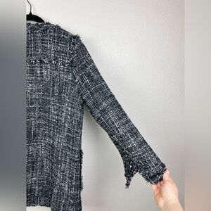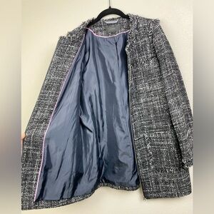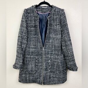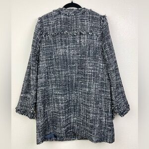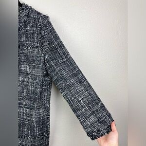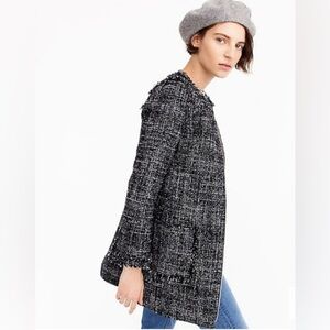 J.Crew Women's 12 Boucle Tweed Knit Swing Coat Full Zip Pockets Collarless Raven Black White Academia Office Career Cocktails Fringe Trim