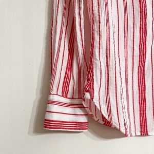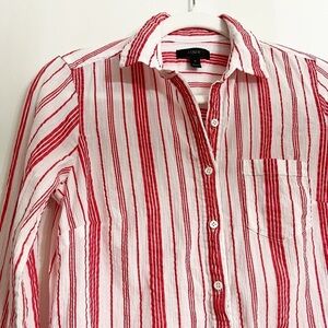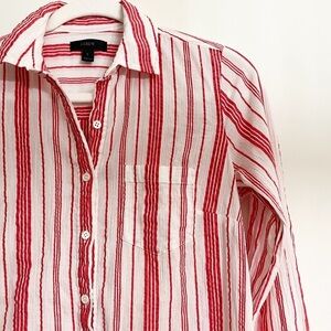 J.Crew Women’s 1/2 Button Front Shirt in Red and White Stripe; Long Sleeves ; Single chest Pocket; Collared; Sheer