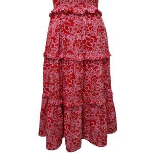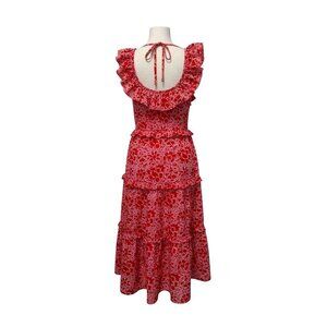 This midi dress features a vibrant red and pink floral design with a tiered ruffle silhouette. Crafted from 100% cotton, it is both breathable and fully lined for added comfort. The tie-back detailing and hidden side zip provide a tailored fit, making this dress elegant and functional.