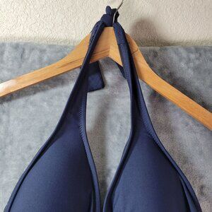 This J.Crew women’s one-piece swimsuit, style B6757, in size 8 features a flattering halter neckline and ruched front for a sleek, slimming fit. The deep navy color offers timeless elegance, making it perfect for beach days, poolside lounging, or resort vacations. Crafted in the USA from a comfortable stretch fabric blend.