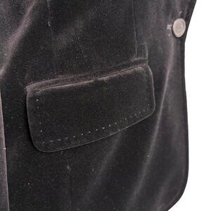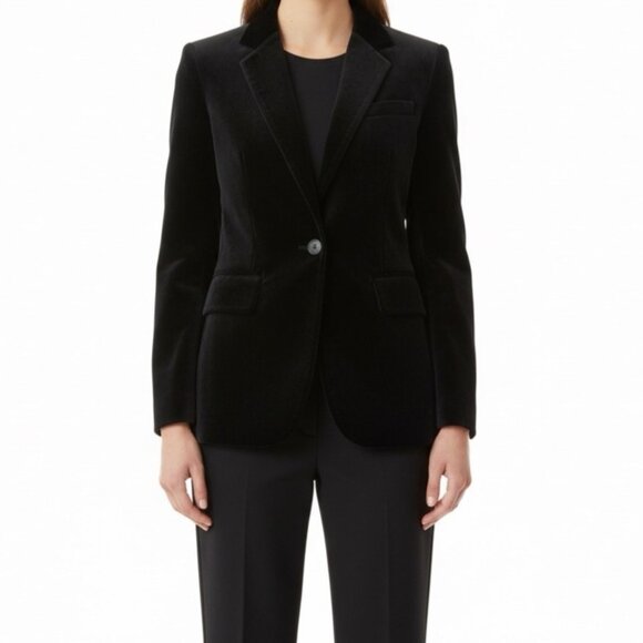 J.Crew Women's Black Cotton Blazer Single-Button Velvet Style Size 4. Crafted from 100% cotton with a luxurious velvet finish and features an acetate lining for durability. Includes front flap pockets, a single-button closure, and tailored for a sleek silhouette. Dry clean only, made in China.