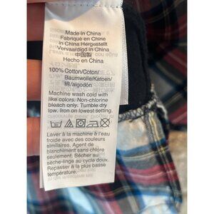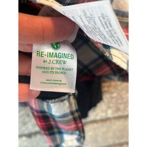This J.Crew sweater offers a delightful juxtaposition of simplicity and charm. The black knit design is elevated by a vibrant red and blue plaid collar and hem, creating a layered look with ease. Its lightweight cotton fabric makes it a timeless piece for transitional weather or cozy gatherings.