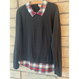 J.Crew Womens Black Sweater With Red/Blue Plaid Collar & Hem Size M 100% Cotton