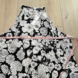 Description: Black and white floral halter style tank with button closure on back of neck and keyhole detail.