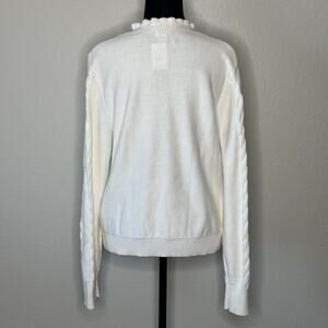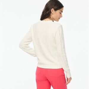 J.Crew cable-knit hearts crewneck sweater in ivory. Features charming heart accents, ribbed trim, and a feminine ruffled neckline for a classic yet playful look. Crafted from 100% cotton for a soft, breathable feel. Regular fit designed to hit at the hip. Item is new with tags.