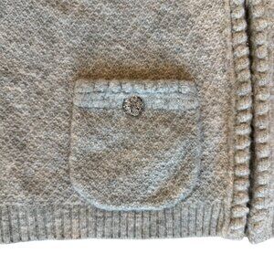 Chic J.Crew cardigan sweater jacket in soft heather gray wool blend with elegant details. Features four front patch pockets with rhinestone button accents, crew neckline, and jeweled button cuffs. Midweight knit with a structured, jacket-like fit — perfect for layering from work to weekend.